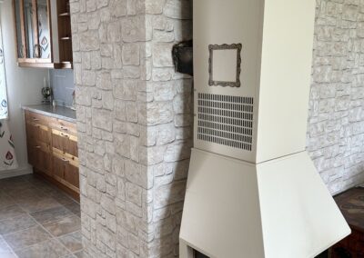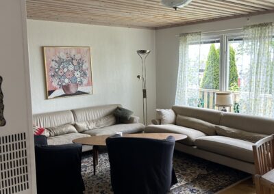 Vardagsrum med soffgrupp, matbord och kamin.